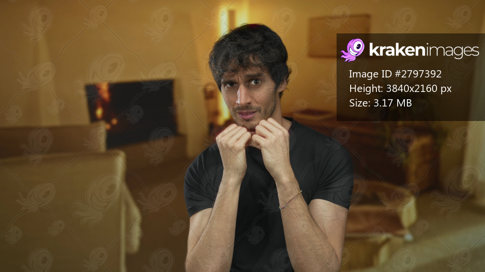 Man covering face with hands while peeking through fingers in living room under warm lighting; anxiety.