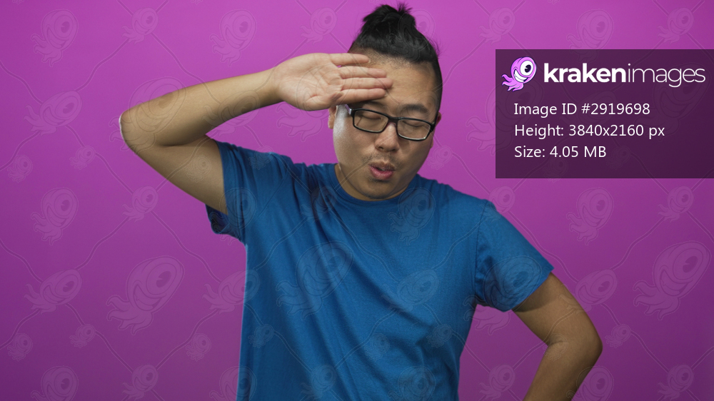 Man covering forehead with hand and squinting eyes in magenta studio while standing in blue shirt, arm bent hand to face; fatigue.