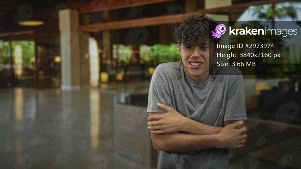Man covering hands over mouth in hotel building lobby with hunched shoulders and tense expression; anxiety vulnerability.