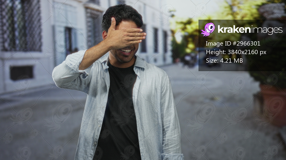 Man covering his eyes with one hand, then beckoning and blowing a kiss while smiling on a street; playful flirtation.