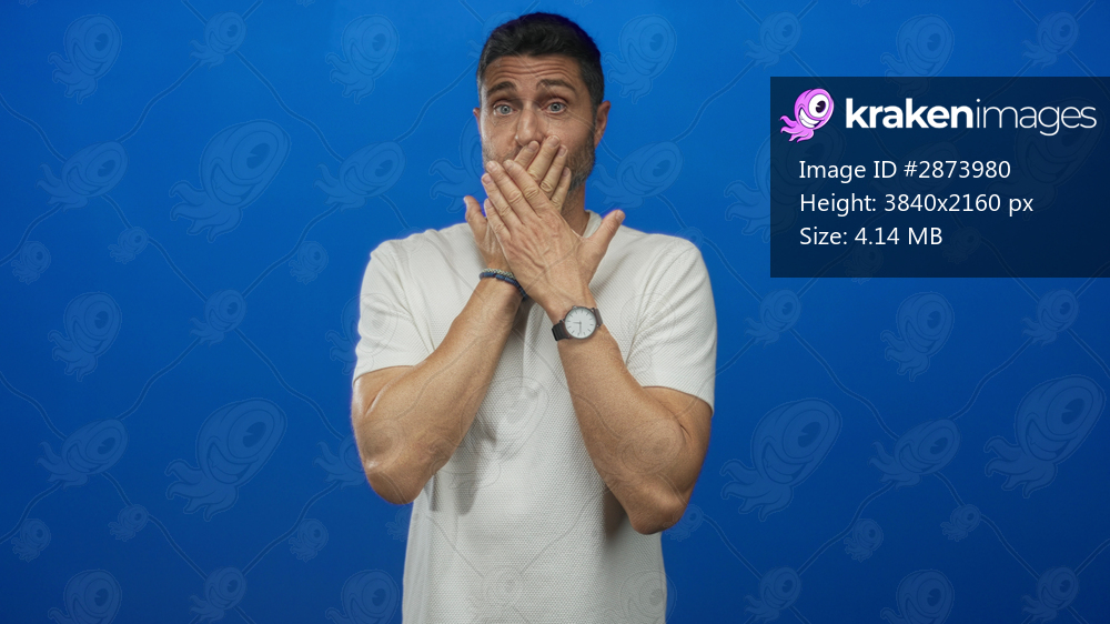 Man covering mouth with both hands wearing a white t shirt and watch in studio against vivid blue backdrop; surprise silence.