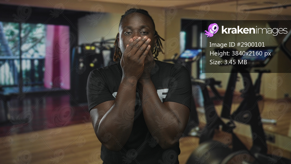 Man covering mouth with both hands while facing camera in gym with exercise bikes and mirrors visible; surprise silence.