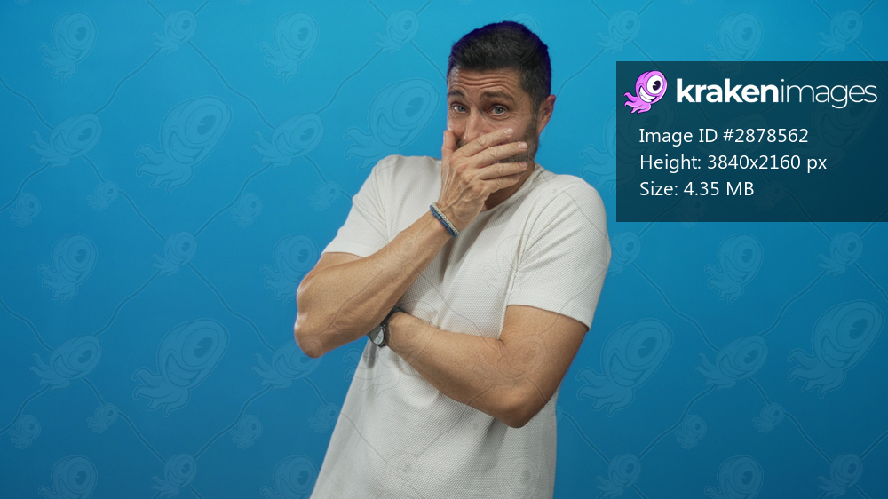 Man covering mouth with hand, arm crossed over chest, wearing white t shirt in blue studio; surprise hesitation.
