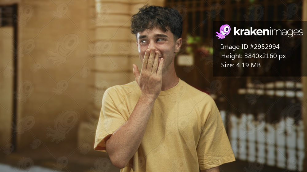 Man covering mouth with hand at building entrance wearing yellow tshirt and making a gesture to camera; surprised casual moment.