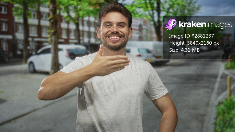 Man covering mouth with hand and gesturing palm forward on city street with parked cars and leafy trees; shyness self control.