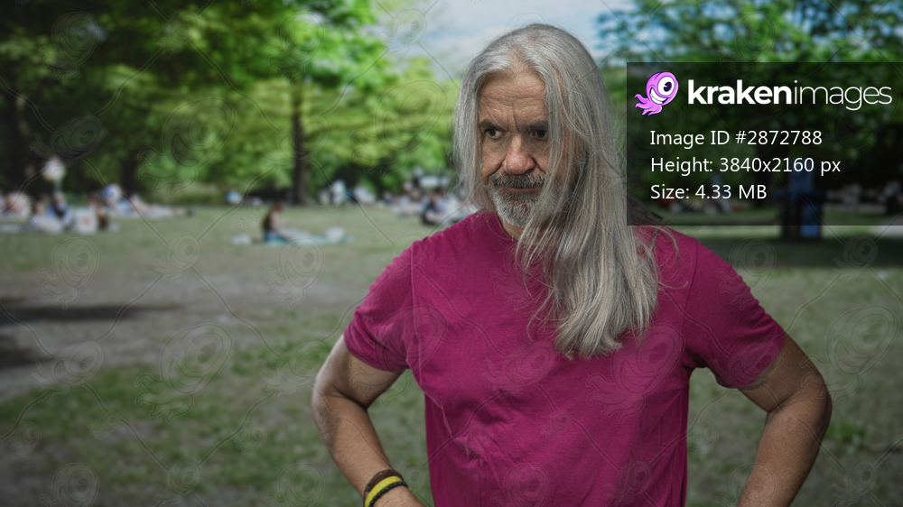 Man covering mouth with hand in forest park with long gray hair, wearing pink shirt; concern reflection.