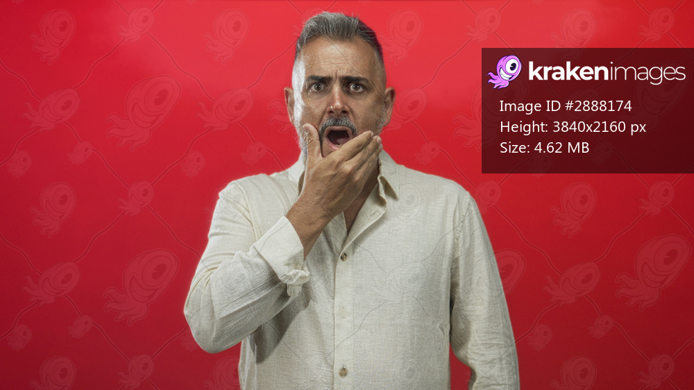 Man covering mouth with hand in studio with red backdrop, wearing beige linen shirt and staring forward; surprise silence.
