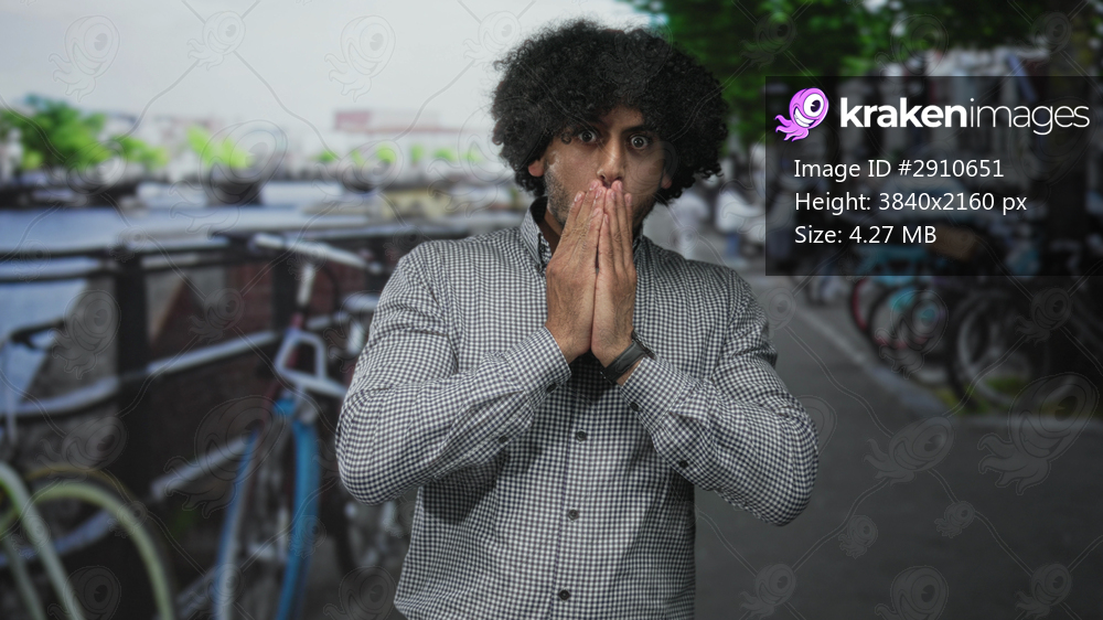 Man covering mouth with hand on amsterdam street by bicycles and canal, wearing checked shirt and wristwatch; surprise reflection.