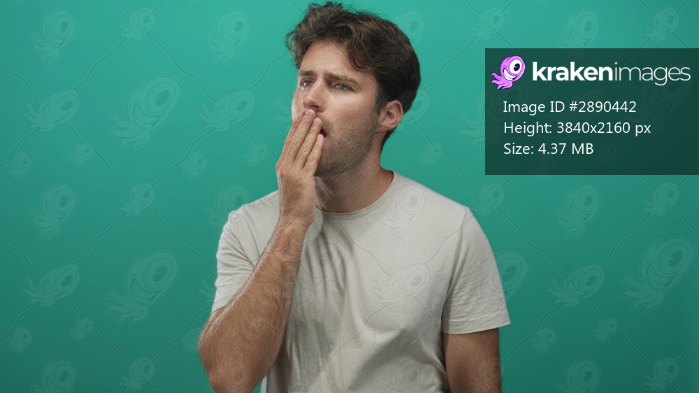 Man covering mouth with hand and yawning in a teal studio, wearing a light t shirt and looking upward; tired contemplation.