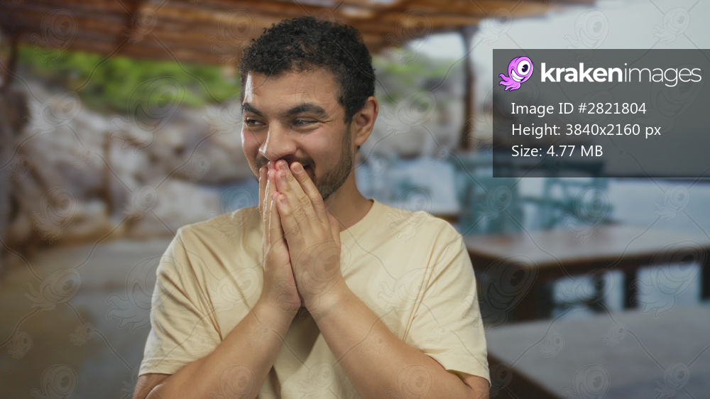 Man covering mouth with hands at seaside building on beach under wooden canopy by weathered table and chairs overlooking rocky coastline; joy.