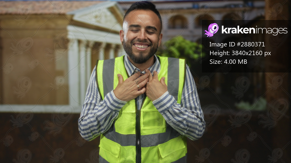 Man covering mouth with hands in building, wearing high visibility vest and striped shirt; relief gratitude.