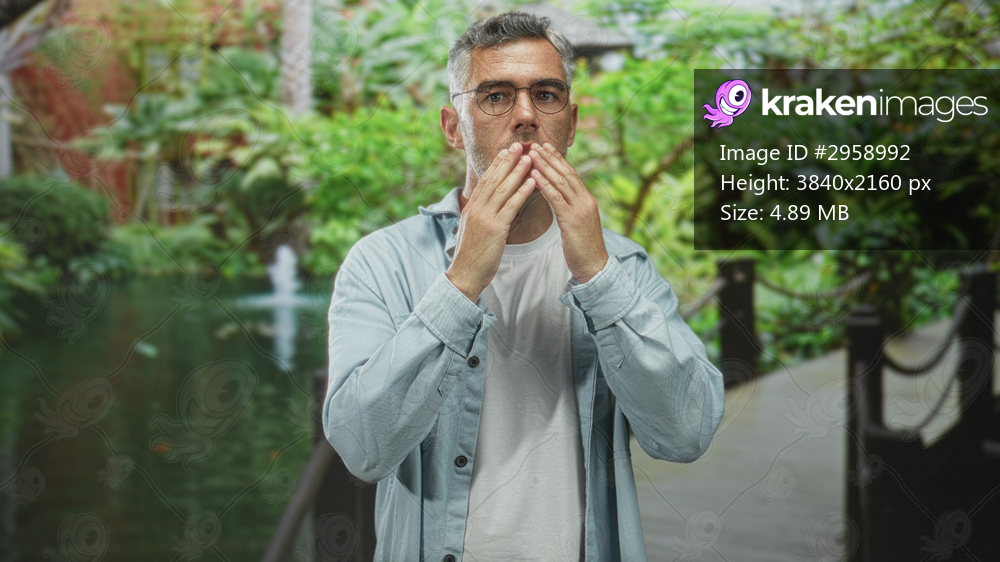 Man covering mouth with hands in garden by pond and fountain, wearing glasses and denim jacket over white tshirt; surprise contemplation.