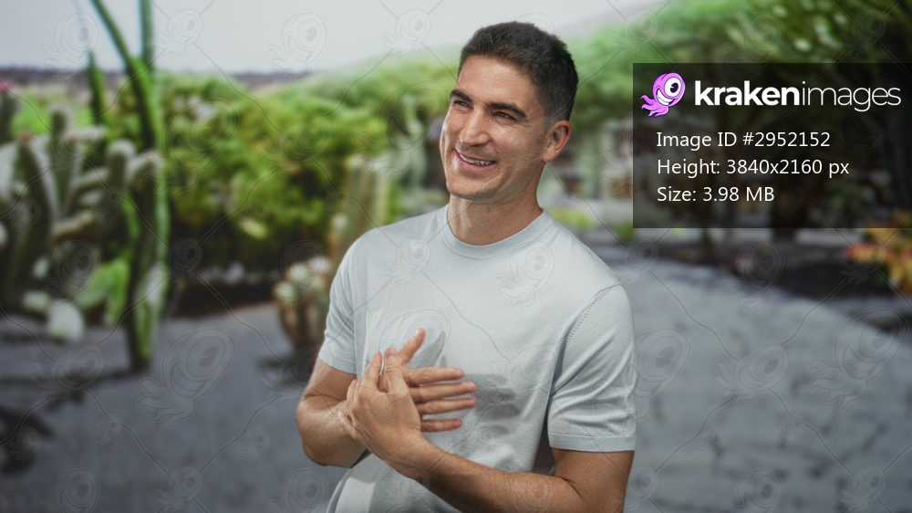 Man covering mouth with hands on a forest path outdoors, laughing and gesturing with forearms visible; joy laughter.