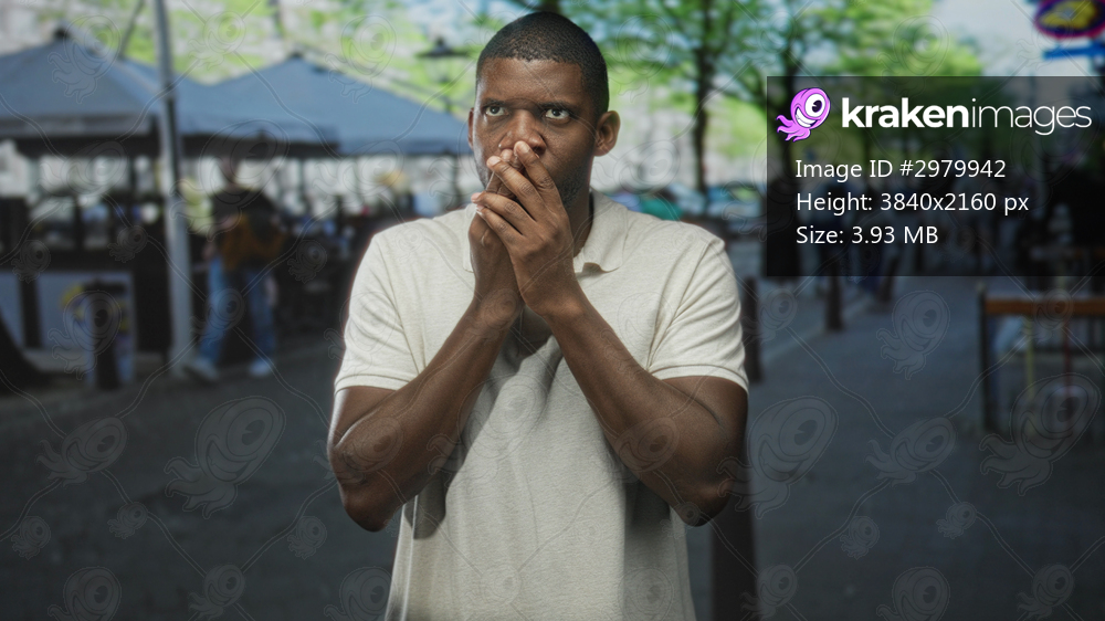 Man covering mouth with hands on crowded street market stalls and canopy tents and pedestrians; anxiety vulnerability hesitation.