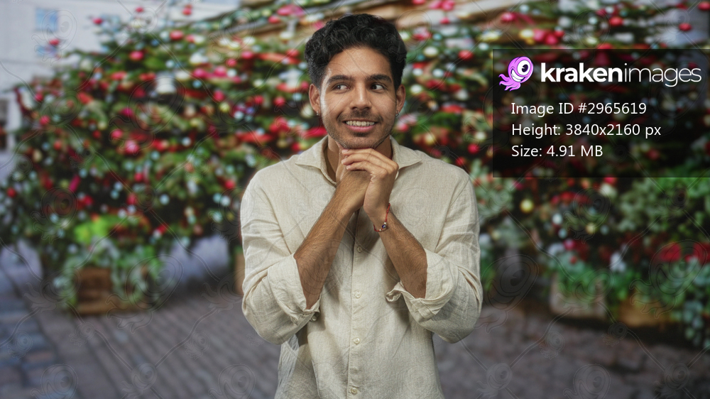 Man covering mouth with hands on street by decorated tree and market stalls; surprise joy holiday warmth.