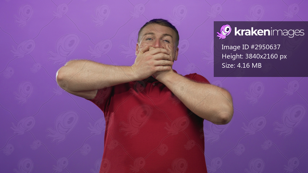 Man covering mouth with hands wearing red shirt young overweight in purple studio; surprise secrecy.