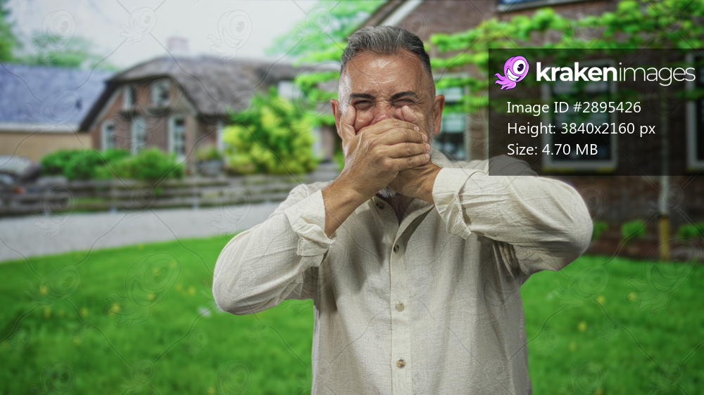 Man covering mouth with hands while holding back laughter at a building entrance of a house; amusement silence.