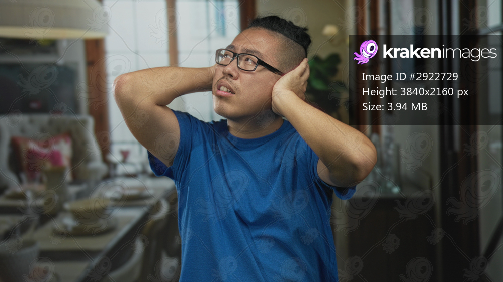 Man covers ears with hands in living room of a building while looking up toward ceiling; sensory overload frustrated.