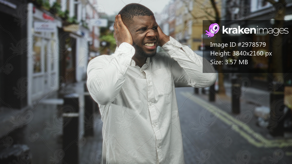 Man covers ears with hands on a narrow street, grimacing and squeezing eyes shut against loud traffic and street noise; distress.