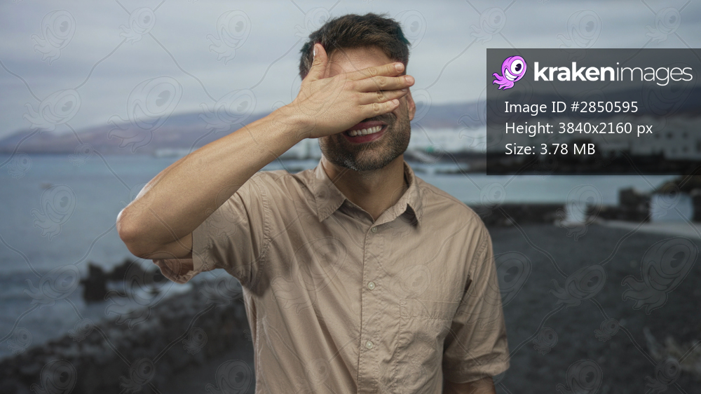 Man covers eyes with hand at a rocky seaside beach under overcast sky and distant shore; denial introspection.