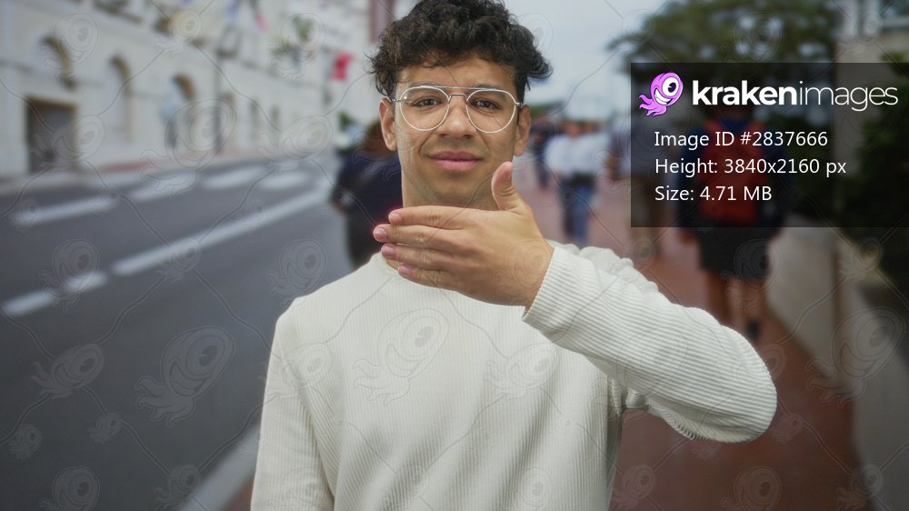 Man covers eyes with hand while standing among blurred pedestrians on busy city street; embarrassment.