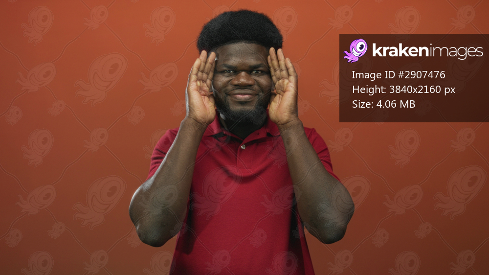 Man covers eyes with hands in studio orange wall wearing red polo shirt, hands over face visible gesture; shyness introspection.