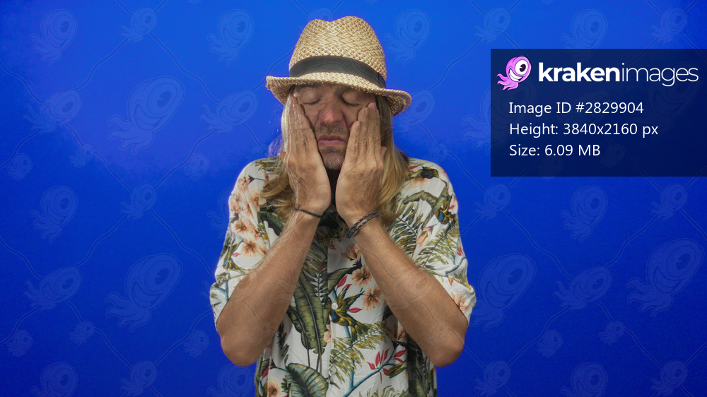 Man covers eyes with hands wearing straw hat and tropical shirt against blue backdrop in studio; mystery.