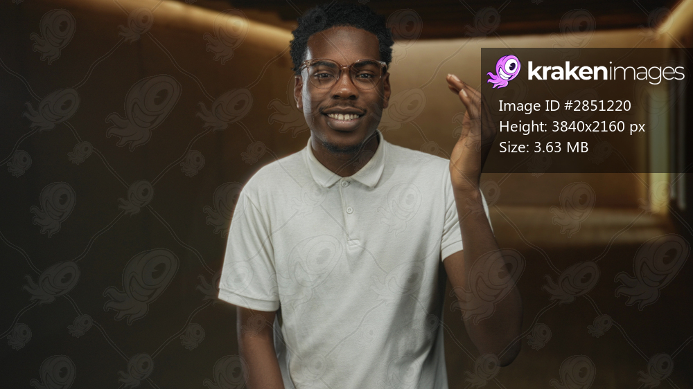 Man covers face with hand in studio corridor with warm lighting and textured walls while wearing polo shirt and glasses, scrunched expression; mystery. - Kraken Images