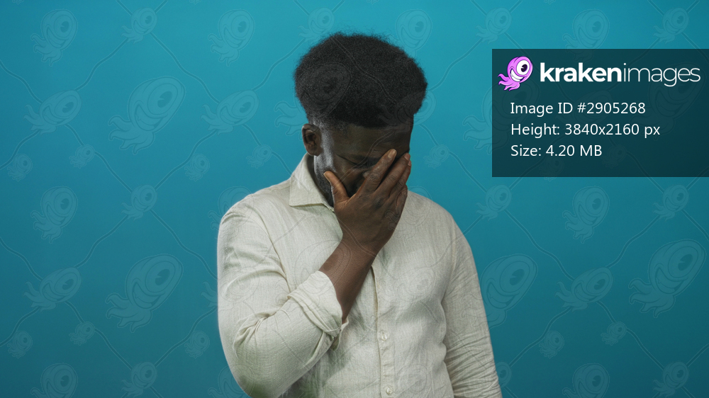 Man covers face with hand in studio teal wall, hand over eyes and lowered head showing concealment; embarrassment fatigue.
