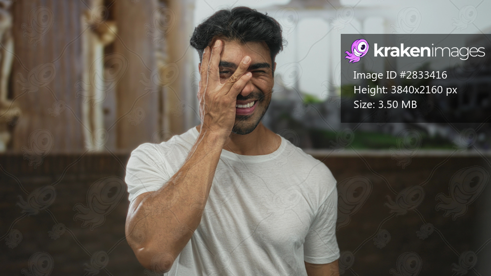 Man covers face with hand while smiling at roman ruins building in bright midday sunlight; amusement.