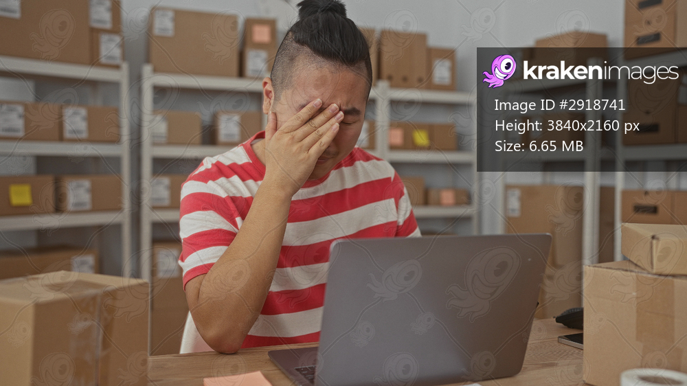 Man covers face with hand and works at laptop amid stacked parcel boxes in a building storage office; stress.