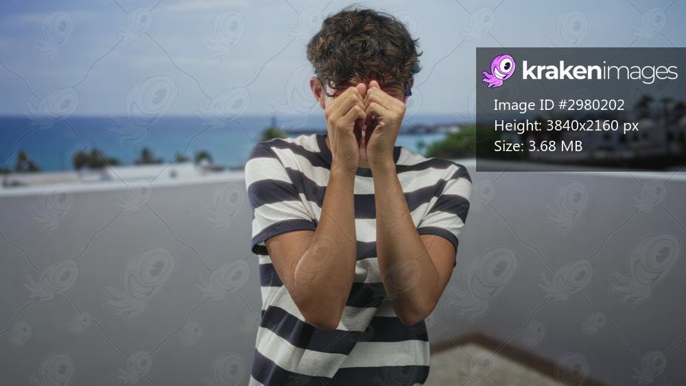 Man covers face with hands and forearms raised, wearing striped shirt on a building balcony overlooking the sea and white rooftops; embarrassment.