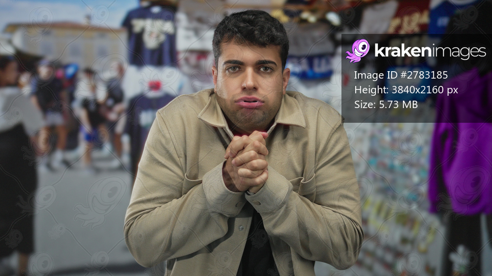 Man covers hands as shiver hits market, while male young hispanic visitor scans outdoor stall crowd.
