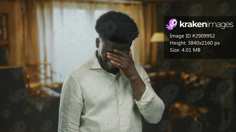 Man covers his face with his hand while standing in a living room beside a sofa and lamp, hand over eyes in a stressed facepalm gesture; frustration.