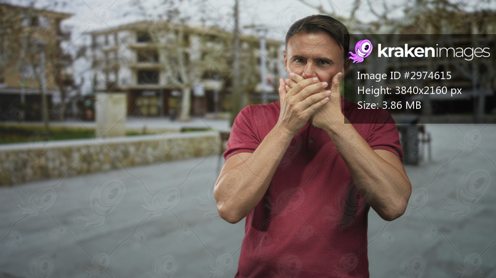 Man covers mouth with both hands on a street, red polo visible and concerned expression; surprise silence.