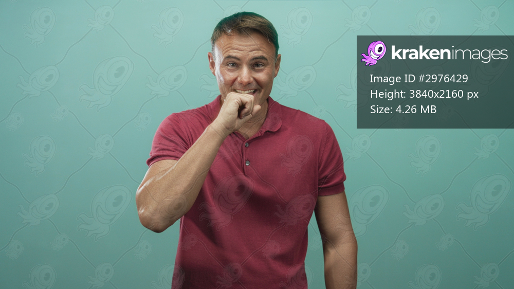 Man covers mouth with fist and smiles toward camera in studio with teal seamless backdrop and red polo shirt, mid laugh gesture; lighthearted amusement. - Kraken Images