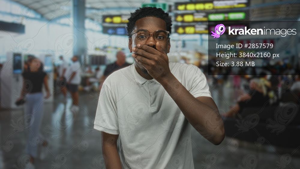 Man covers mouth with hand in busy airport terminal amid travelers wearing white polo shirt and glasses; surprise.