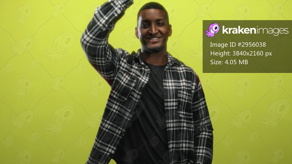 Man covers mouth with hand in studio against lime green backdrop, wearing a plaid flannel shirt and t shirt; playful confidence.