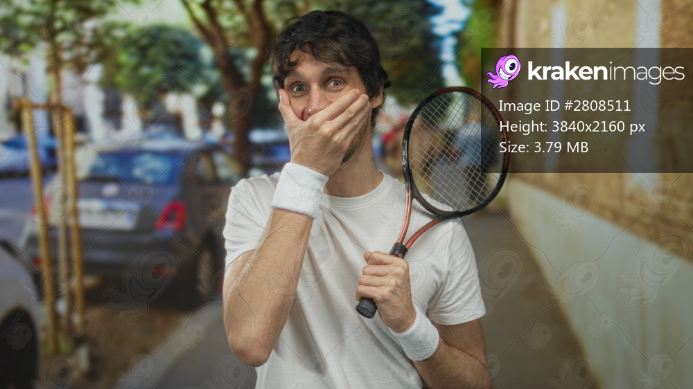 Man covers mouth with hand while holding racket on urban street lined with parked cars and leafy trees; surprise.