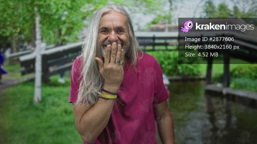 Man covers mouth with hand while smiling on street by amsterdam canal wooden bridge, rings and bracelets visible; amusement.