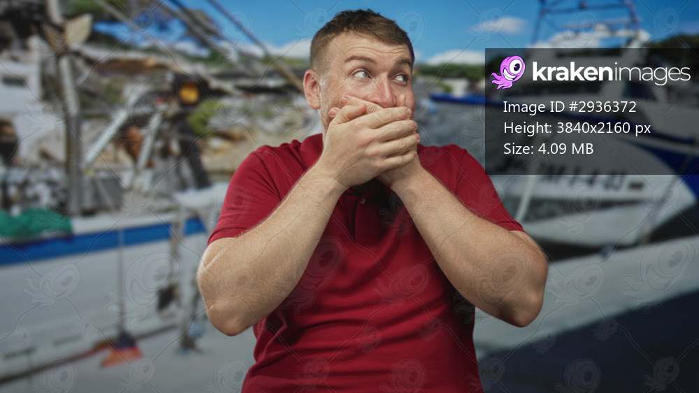 Man covers mouth with hands on a boat at a port marina, red polo shirt, wide eyes and startled pose; sudden shock.