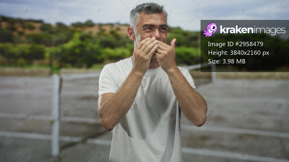 Man covers mouth with hands on outdoor court by forest, wearing white tshirt and looking upward; surprise restraint.