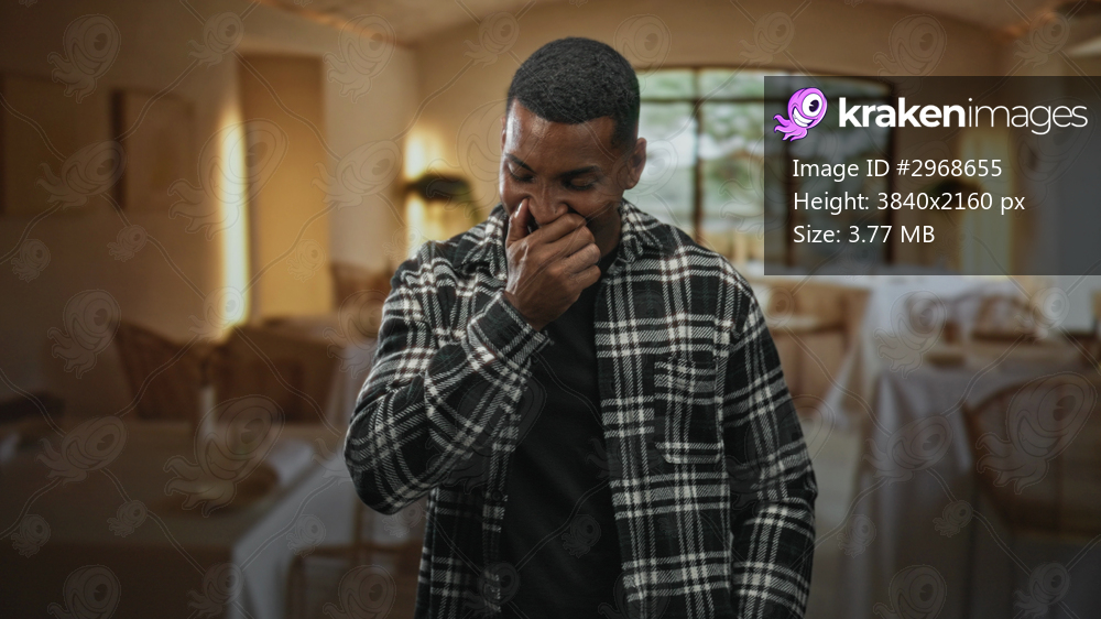 Man covers nose with hand in a restaurant dining area inside a building, plaid shirt, standing near set tables and window light; disgust avoidance.