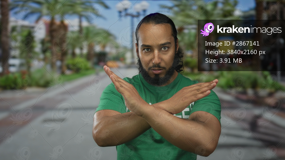 Man with crossed arms forming an x gesture, hands and forearms visible, wearing a green shirt while standing on a sunny street lined with palm trees; rejection protest. - Kraken Images