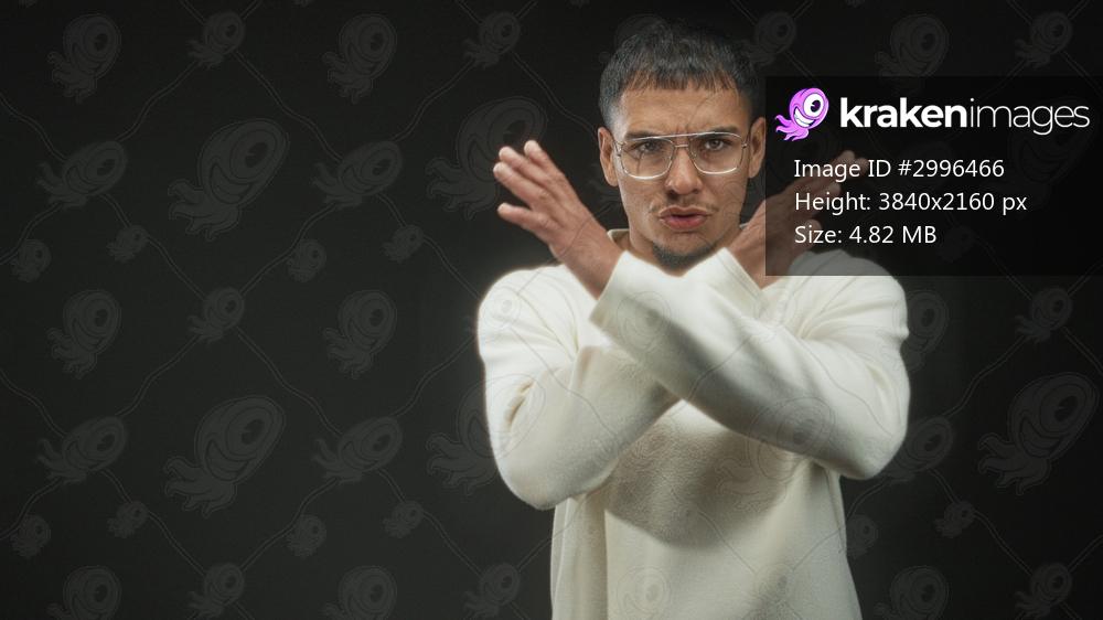 Man with crossed arms forming an x gesture, wearing glasses and white sweater in a studio setting; defiance.
