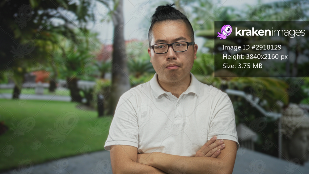 Man with crossed arms and glasses in park wearing white polo, looking pensive with a thoughtful gaze; contemplation reflection.