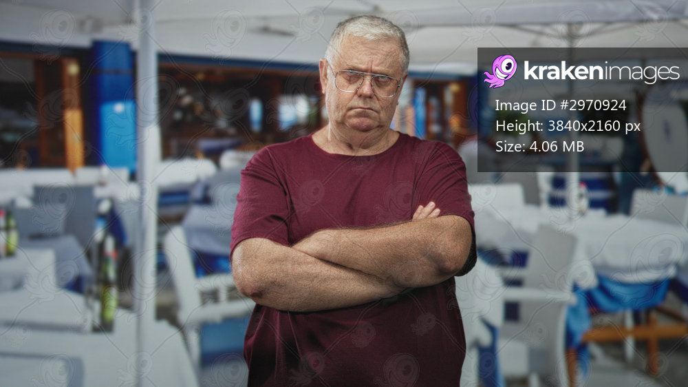 Man with crossed arms and glasses, maroon shirt, visible forearms, standing amid empty tables at a restaurant building; disapproval stubbornness.