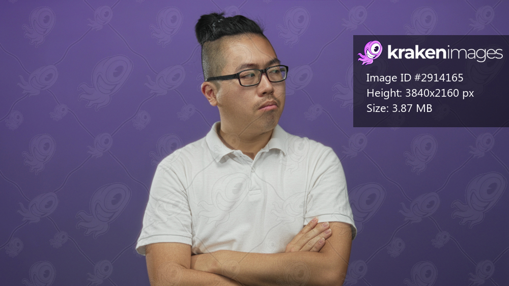 Man with crossed arms and glasses, wearing white polo and topknot, looking sideways in studio against a purple wall; skepticism introspection.