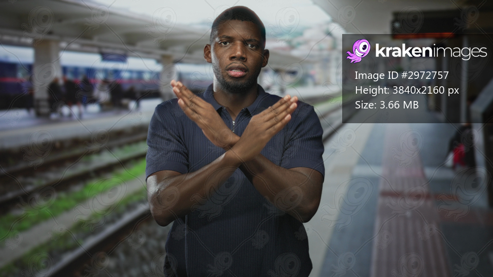 Man with crossed arms hands forming x gesture on a station platform inside a building beside train tracks and tactile paving; defiance.