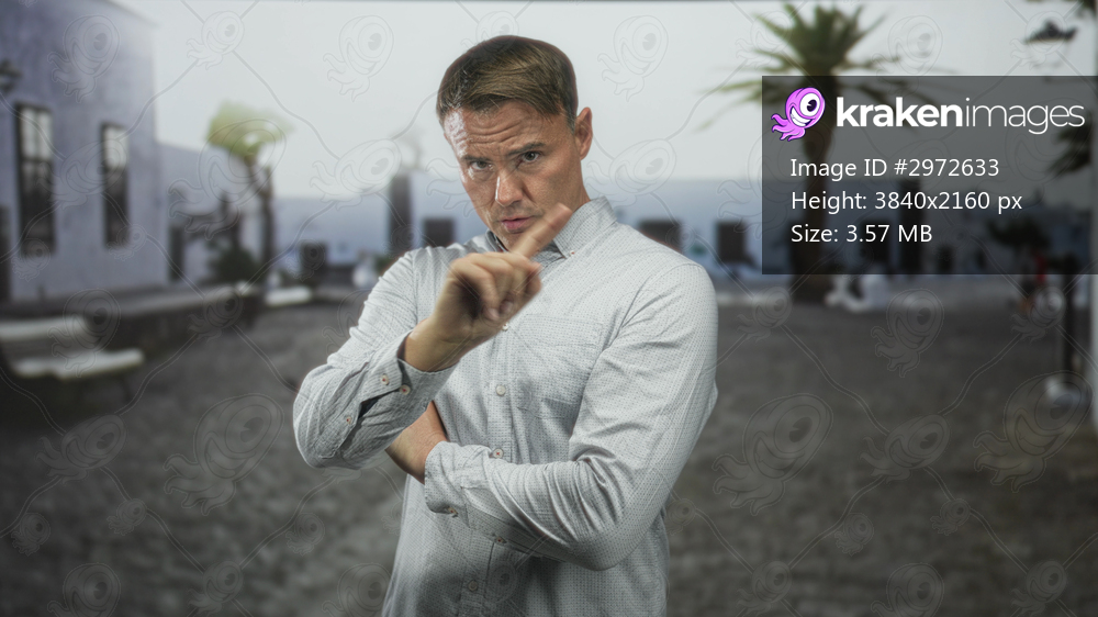 Man with crossed arms and raised index finger on street by palm tree and bench; skepticism defiance.